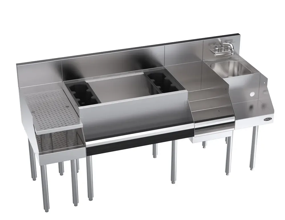 Take your kitchen to the next level with the Krowne Metal KR24-W66C-10 Workstation. This Royal Series 66" Recessed Drainboard/Ice Bin/Blender/Liquor Display Workstation with Cold Plate is designed to enhance efficiency and functionality in a commercial restaurant setting. With its 10 circuit cold plate, this workstation ensures that your beverages stay chilled and ready to serve. The liquor display adds a touch of elegance and convenience, allowing bartenders to showcase their selection of spirits. The recessed drainboard and ice bin provide a dedicated space for washing and storing glassware, while the blender station allows for quick and easy preparation of delicious cocktails. Made by Krowne Metal, a trusted name in the industry, this workstation is built to last and withstand the demands of a busy restaurant. Upgrade your kitchen with the Krowne Metal KR24-W66C-10 Workstation and experience improved workflow and customer satisfaction.