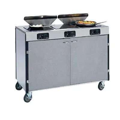 Upgrade your restaurant workflow with the innovative Lakeside Manufacturing, 2085, Induction Hot Food Serving Counter. This mobile cooking cart is designed to enhance efficiency and convenience in a commercial restaurant setting. With a temperature range of 90 - 440F and an LED control panel, you can easily adjust and monitor cooking conditions. The cart features three induction heat stoves, allowing you to cook multiple dishes simultaneously. The two down draft filtration systems ensure a clean and odor-free environment. The laminated front and ends, along with the stainless steel top and interior, provide durability and easy cleaning. The cart is equipped with doors for secure storage and 5" swivel No-Mark polyurethane casters for smooth mobility. ETL certified and made in the USA, this Lakeside Manufacturing serving counter is a reliable and high-quality addition to any commercial kitchen. Upgrade your workflow today and experience the benefits of this exceptional product.