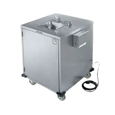 Enhance sustainability using Lakeside Manufacturing's 9600 Mobile Hand Sink. This versatile and efficient hand washing station is designed specifically for commercial restaurant use. With a 5-gallon fresh water capacity and a 7-gallon waste water capacity, it ensures a continuous supply of clean water while minimizing waste. The 10" x 12" x 5" sink bowl, made of stainless steel, provides ample space for thorough hand washing. The chrome plated brass heavy-duty faucet features on/off wrist blade controls for easy operation. The sink also includes a chrome plated soap dispenser for added convenience. The locking door latch ensures security, while the corner bumpers protect against accidental damage. Equipped with 5" No-Mark casters, including two swivel casters with brakes, this mobile hand sink is easy to maneuver and lock in place. Made in the USA, it meets the highest standards of quality and durability. Upgrade your restaurant's hygiene practices with the Lakeside Manufacturing 9600 Mobile Hand Sink.