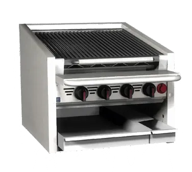 Revolutionize your cooking setup with the Magikitchn CM-SMB-624 Gas Countertop Charbroiler. This high-quality charbroiler is designed to meet the demands of a commercial restaurant kitchen. With a 24" wide cooking surface and a free-floating round rod top grate, you can easily cook a variety of foods to perfection. The EZ tilt to front grease trough ensures easy cleanup, while the ceramic briquettes provide even heat distribution for consistent cooking results. Made of 95% stainless steel, this charbroiler is built to last and withstand the rigors of a busy kitchen. It also features a 6" service shelf with a utility bar, allowing you to keep your cooking tools within reach. The water tubs help to control flare-ups and add moisture to your dishes. Whether you're grilling steaks, burgers, or vegetables, the Magikitchn CM-SMB-624 Gas Countertop Charbroiler is the perfect addition to your restaurant kitchen.