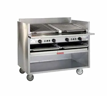 Experience kitchen innovation with the Magikitchn FM-SMB-672 Gas Floor Model Charbroiler. This 72" wide, 34" high charbroiler is designed to meet the demands of a commercial restaurant. The free-floating round rod top grate with EZ tilt to front grease trough ensures even heat distribution and easy cleaning. The ceramic briquettes provide consistent heat and reduce flare-ups, while the 95% stainless steel construction ensures durability and longevity. With a 6" service shelf and utility bar, you have ample space for food preparation and storage. The open cabinet base allows for convenient access to supplies, and the 6" adjustable legs ensure stability on any surface. Additionally, the top grid scraper makes cleaning a breeze. Whether you're grilling steaks, burgers, or vegetables, the Magikitchn FM-SMB-672 Gas Floor Model Charbroiler is the perfect addition to your commercial kitchen.