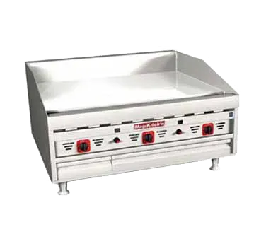 Boost your restaurant's performance with the Magikitchn MKG-36-ST Gas Countertop Griddle. This high-quality griddle is designed to meet the demands of a busy commercial kitchen. With a spacious 35-3/4" W x 24" D cooking surface, you'll have plenty of room to cook multiple items at once. The 1" thick polished griddle plate ensures even heat distribution for consistent cooking results. The solid state thermostat with matchless ignition allows for precise temperature control, while the grease chute and box, along with the front grease trough, make cleaning up a breeze. The 3" side splash helps contain any splatters, keeping your kitchen clean and safe. Made of durable stainless steel, this griddle is built to withstand the rigors of a commercial restaurant. With 90000 BTU of power, this griddle can handle any cooking task. Upgrade your kitchen with the Magikitchn MKG-36-ST Gas Countertop Griddle and experience enhanced efficiency and productivity.