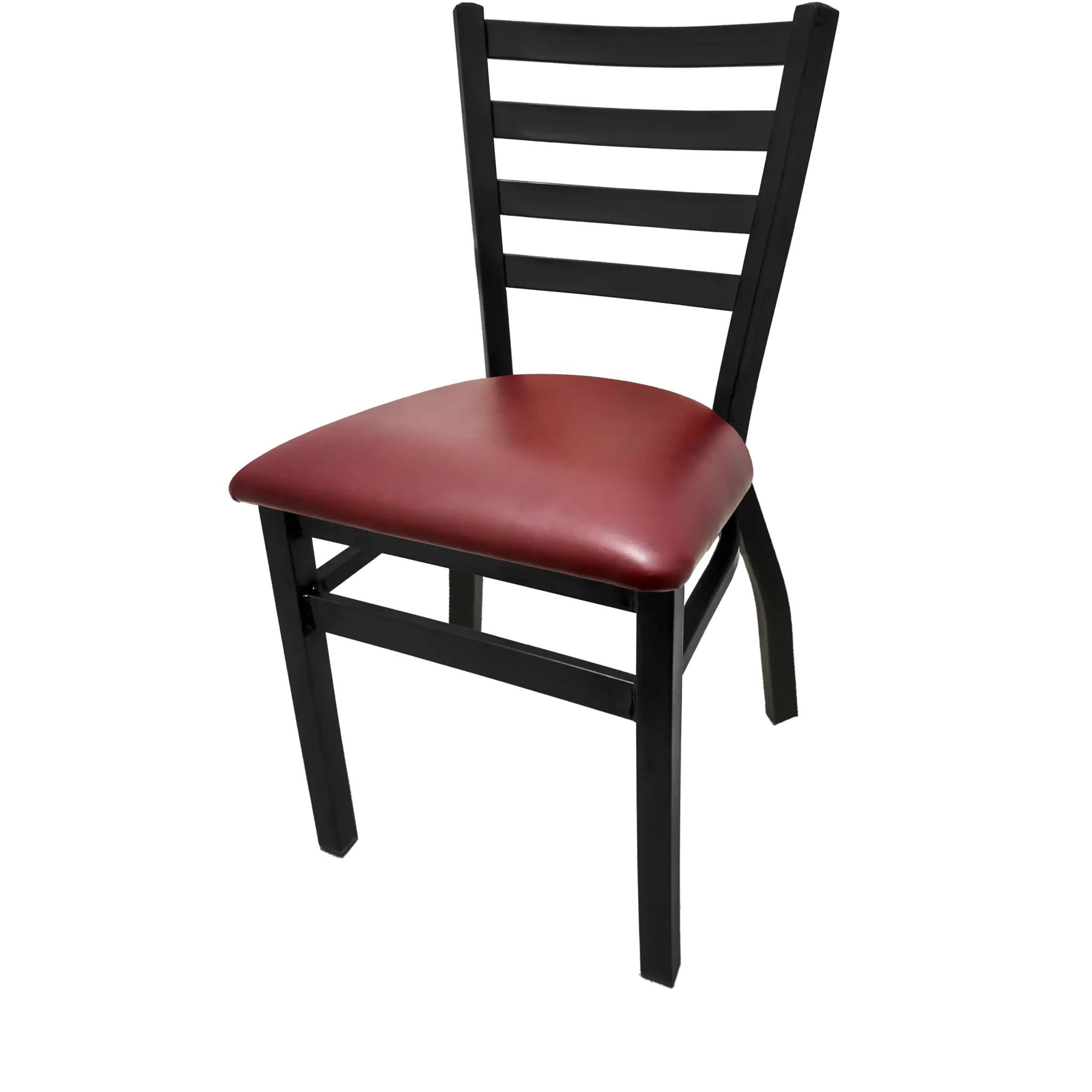 Enhance Vision Elegant Decor with the Oak Street ST2160-WINE Chair. This stackable ladderback chair is designed for commercial restaurant use, offering both style and durability. The premium black powder coat finish and 1.2mm steel frame ensure long-lasting performance, while the wine vinyl seat adds a touch of elegance. With a 100% welded frame and footring, this chair provides stability and support for your guests. The two leg supports and non-marring glides protect your floors from scratches and scuffs. Plus, the maximum stacking height of 5 chairs allows for easy storage when not in use. The seat ships unattached from the frame, but simple attachment is required. Perfect for indoor use, this Oak Street chair is a must-have for any restaurant looking to enhance their decor and provide comfortable seating for their guests.