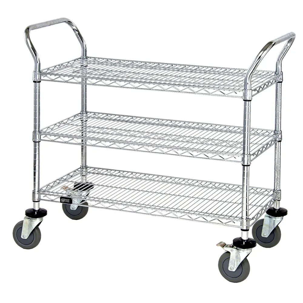 Enhance your restaurant's efficiency with the Quantum Foodservice WRC-2436-3 Cart, Bussing Utility Transport. This chrome-plated cart is designed to streamline your restaurant operations, making it easier than ever to transport items from one place to another. With three wire shelves and a 1200 lb. capacity, this cart can handle heavy loads with ease. The two "U" shaped handles provide a comfortable grip, allowing for smooth maneuverability. The open base design allows for easy access to items on the shelves, while the donut bumpers protect walls and furniture from accidental collisions. Equipped with four 5" polyurethane swivel casters, including two with brakes, this cart can be easily moved and securely locked in place. NSF approved, this cart meets the highest standards of sanitation and safety. Upgrade your restaurant's efficiency with the Quantum Foodservice WRC-2436-3 Cart, Bussing Utility Transport.
