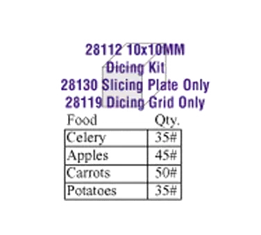 Equip your commercial kitchen with the Robot Coupe, 28112W, Food Processor, Disc Plate, Dicing. This high-quality food processor is a must-have for any restaurant looking to streamline their food preparation process. With its AA 10x10 Dicing Kit Series "D" Expert, this food processor allows you to dice ingredients quickly and efficiently, saving you valuable time in the kitchen. This food processor is designed specifically for commercial use, ensuring that it can withstand the demands of a busy restaurant kitchen. Whether you need to dice vegetables for a salad or prepare ingredients for a stir-fry, the Robot Coupe, 28112W, Food Processor, Disc Plate, Dicing is the perfect tool to help you get the job done quickly and efficiently. Upgrade your kitchen today and experience the convenience and efficiency of the Robot Coupe, 28112W.