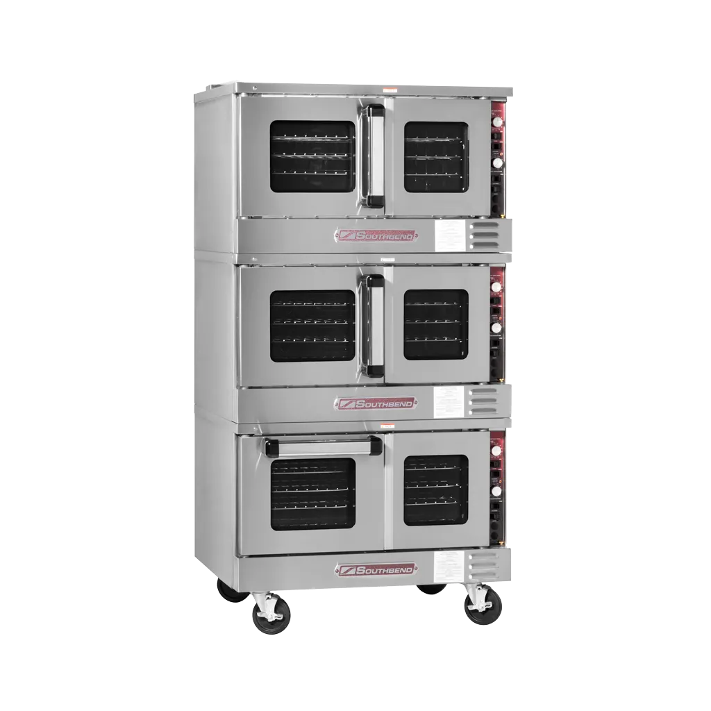 Deliver food perfection with the Southbend TVGS/32SC Gas Convection Oven. This low-profile, triple-deck oven is designed to meet the demands of a busy commercial restaurant kitchen. With its electronic ignition and solid state thermostatic controls, you can easily achieve the perfect cooking temperature ranging from 150 to 550 degrees Fahrenheit. The 60-minute mechanical cook timer ensures precise cooking times, while the oven interior light allows you to monitor your dishes without opening the door and losing heat. The cool-down fan helps to quickly cool the oven after use, allowing for efficient turnaround times. Each oven comes with three racks, providing ample space for multiple dishes. The porcelain oven interior and stainless steel construction make cleaning a breeze. With a powerful 156,000 BTU output and CSA and NSF certifications, this Southbend convection oven is a reliable and high-performing addition to any commercial kitchen.