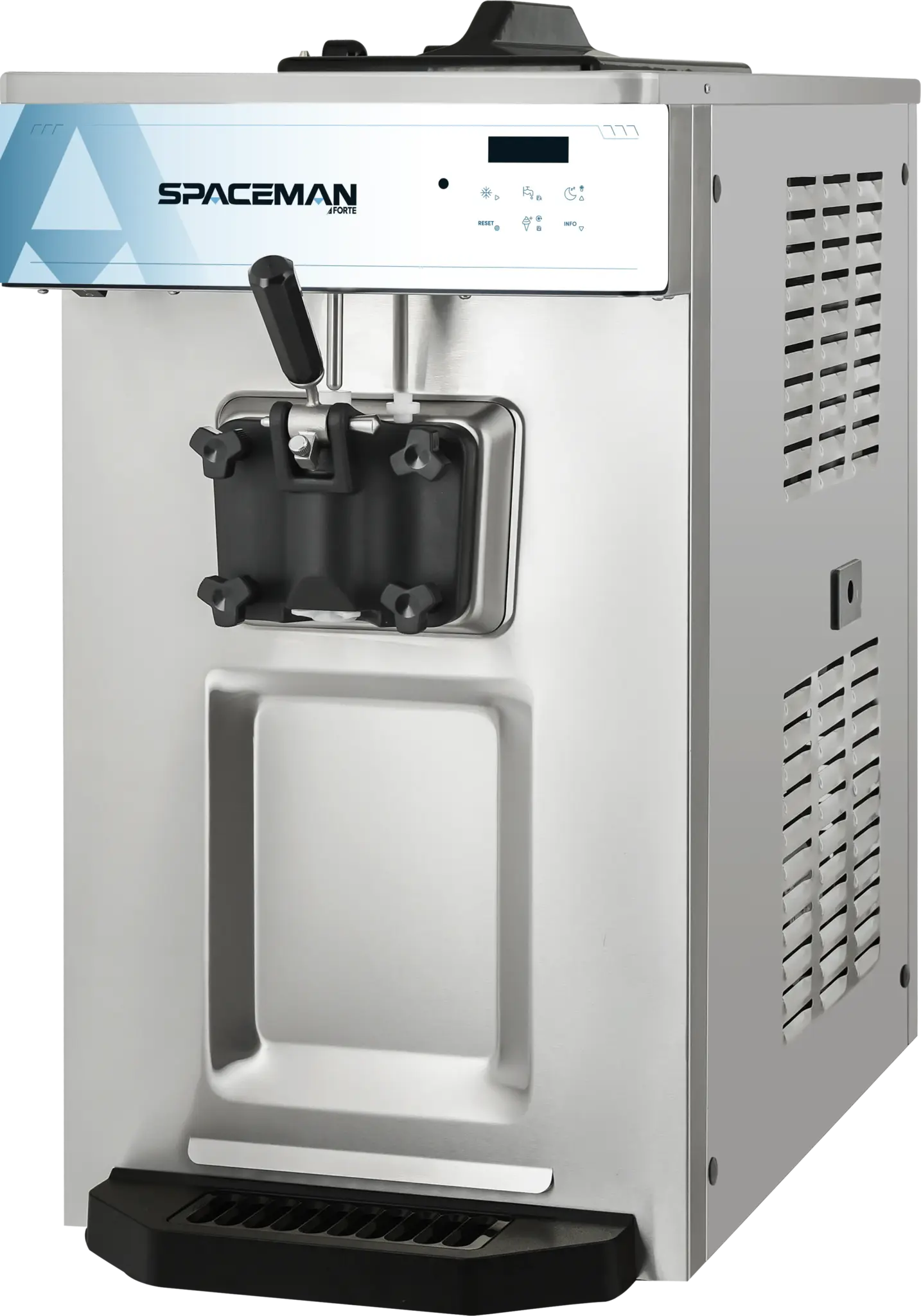 The 6236-C incorporates Spaceman’s patented 100% Controlled Contact Flooded Evaporator, designed for maximum efficiency and delivering the industry’s fastest freeze-down and recovery times with smaller ice crystals and the smoothest, creamiest mouthfeel. Continuous improvements in design, driven by field feedback and R&D, enhance operational efficiency, structural integrity, and serviceability. The advanced V5 single-piece auger ensures full evaporator wall contact, eliminates unnecessary parts, reduces cleaning time, and enhances consistency with the smallest ice crystals in the industry. Smart safety controls and independent standby modes maintain hopper and cylinder temperatures below 4.4ºC (40ºF), optimizing energy efficiency and product quality during non-use. The dual-system gravity-fed air inlet works in tandem with the V5 auger to deliver the most consistent overrun, ensuring long-term texture and superior product quality. The increased 5-gallon hopper capacity allows for larger batch mixing and reduced refill time, improving both efficiency and ease of operation. Finally, inverter motor control enables the use of three-phase motors with single-phase power input, reducing torque and strain by controlling start-up speed—dramatically minimizing gearbox and drivetrain failures caused by operational errors or freeze-ups.