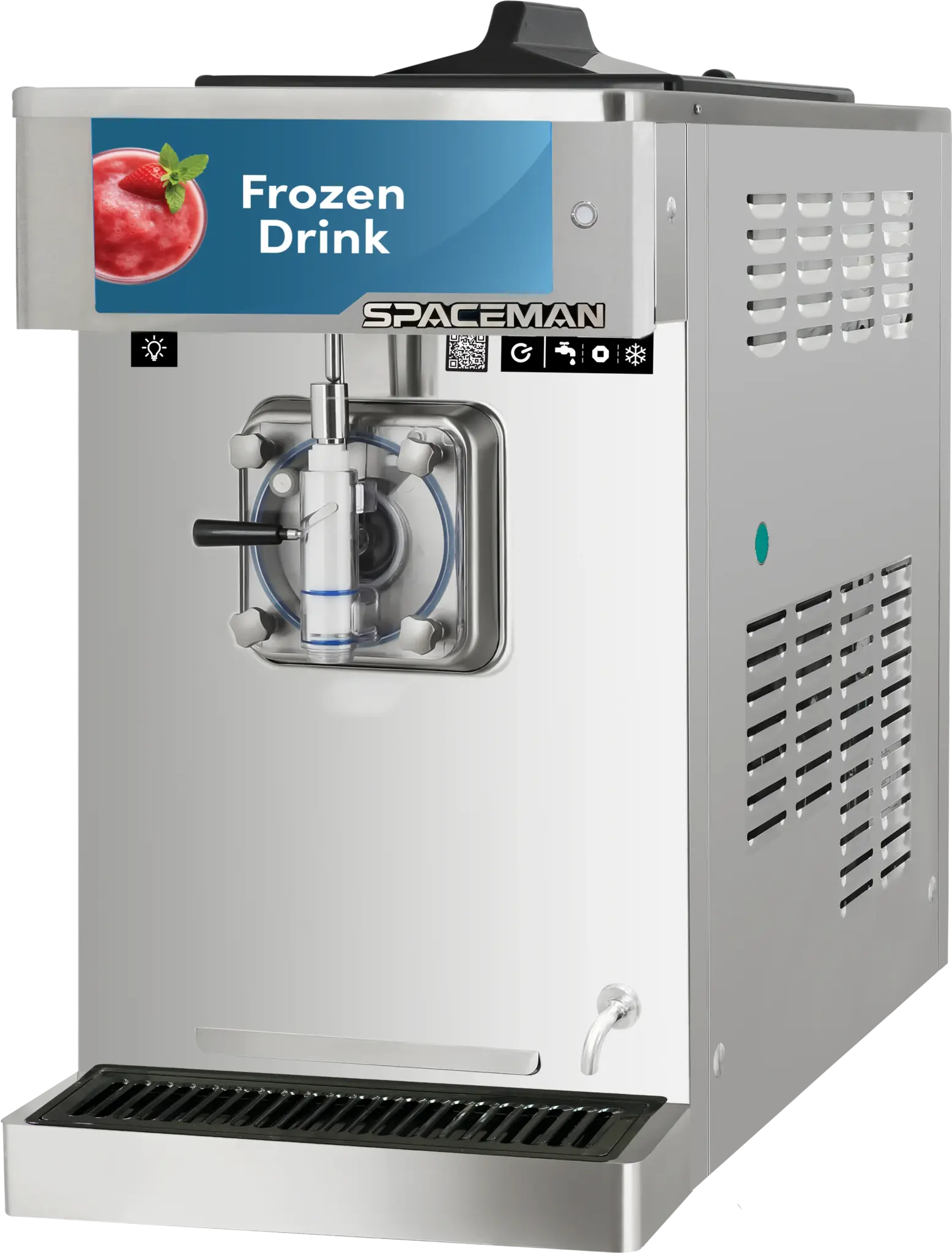 The 6690-CL is a high-volume countertop single flavor frozen beverage machine built for busy operations serving frozen drinks, milkshakes, smoothies, coffee-based beverages, and cocktails. With patented freezing technology and a 7.3qt cylinder, the 6690-CL delivers rapid freeze-down and recovery, producing up to 90 quarts per hour, or 360 (8oz) drinks. Pre-cooling in the hopper refrigerates product before it enters the freezing cylinder, further reducing freeze times while providing food safety approval for storing product overnight, including dairy-based mixes. Its low evaporator temperature also gives the 6690-CL the ability to freeze alcoholic beverages with ease, making it a versatile choice for bars, restaurants, cafés, and high-volume venues. At the heart of its performance is Spaceman’s patented 100% Controlled Contact Flooded Evaporator, engineered for maximum efficiency and delivering the fastest freeze-down and recovery times in the industry. This innovation ensures smaller ice crystals and the smoothest, creamiest mouthfeel. Continuous improvements in design, guided by operator feedback and R&D, enhance reliability, structural integrity, and long-term serviceability. The single-piece V3 auger combines the drive shaft and auger into one solid over-molded plastic and steel assembly. This advanced design reduces parts, cuts cleaning time, and enhances product quality by precisely scraping the cylinder walls and controlling product flow for consistently smaller ice crystals. The overhead design allows operators to switch products and hardness levels in under 30 seconds, while a simple 1–6 consistency setting ensures easy control and standardization across multi-unit operations. Additional operator-focused enhancements include an RGB display with a low-level indicator light that flashes red when product is running low, as well as low-mix freeze protection, which prevents freeze-ups by automatically switching to standby mode when mix runs out. Backlit virtual merchandising provides a high-visibility illuminated display area with interchangeable flavor cards, offering branding and marketing opportunities with dimensions available for custom designs. The 6690-CL also incorporates a powerful drivetrain and advanced control mechanism, engineered specifically to handle the demands of milkshakes while delivering smooth operation and a rich, creamy consistency with every pour. Reliable, efficient, and versatile, the 6690-CL is the perfect solution for high-volume operators seeking frozen beverages that consistently exceed customer expectations.