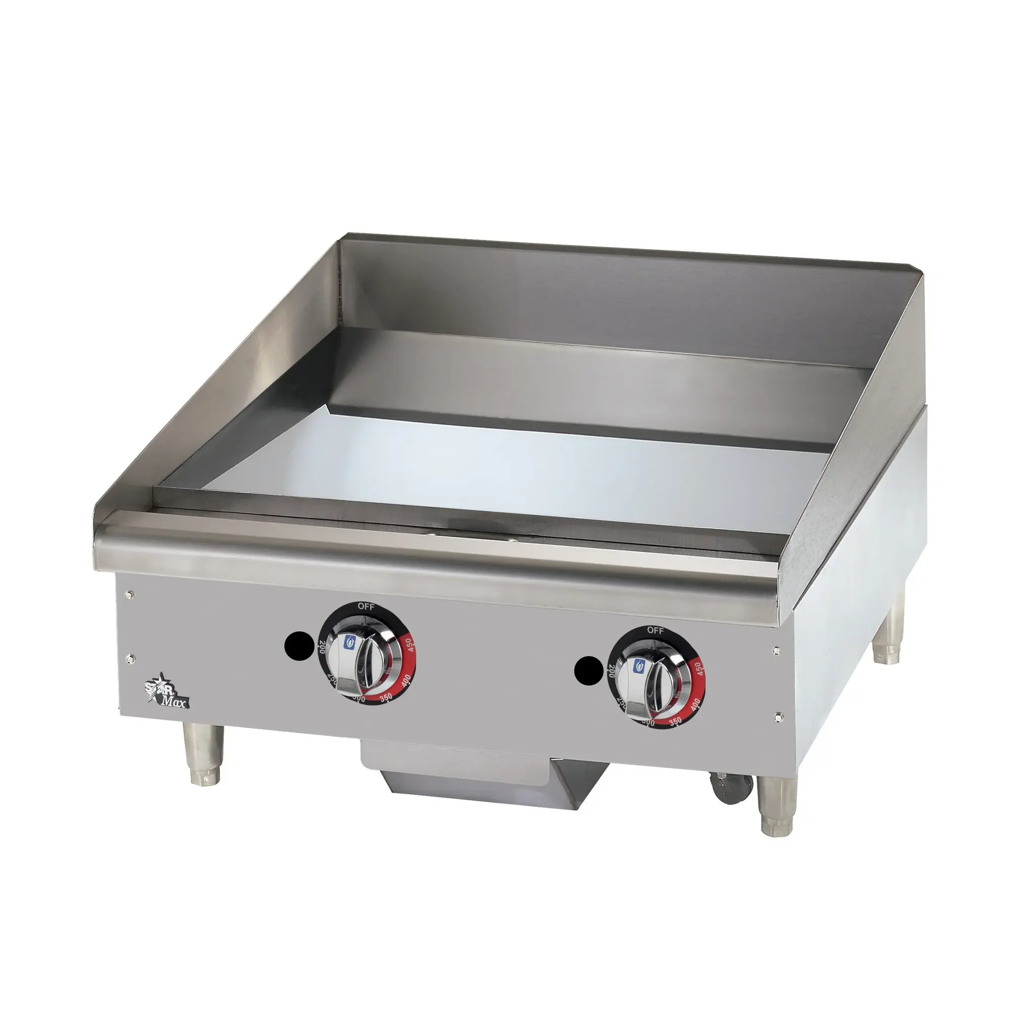 Culinary excellence in every dish starts with the Star, 624TCHSF Gas Countertop Griddle. This heavy-duty griddle is designed to meet the demands of a commercial restaurant kitchen. With a 24" W x 21" D cooking surface and a 1" thick chrome griddle plate, it provides ample space for cooking a variety of dishes. The embedded modulating thermostat every 12" ensures precise temperature control, allowing chefs to achieve perfect results every time. The heavy-duty knobs and wrap-around stainless steel splash guard make it easy to operate and maintain. The grease trough and stainless steel drawer help keep the cooking area clean and organized. Made in the USA, this griddle is built to last with its welded steel frame and stainless steel front. With 56600 BTU of power, it delivers high-performance cooking. Whether you're cooking breakfast favorites, lunch specials, or dinner entrees, the Star, 624TCHSF Gas Countertop Griddle is the perfect addition to any commercial restaurant kitchen.