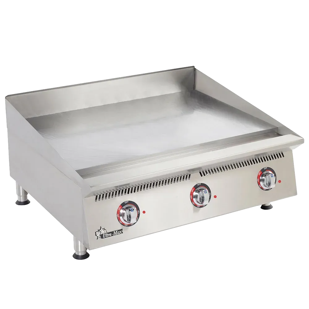 Achieve culinary excellence with the Star, 836TCHSA, Gas Countertop Griddle. This high-quality griddle is designed to meet the demands of a commercial restaurant kitchen. With a 36" wide by 24" deep cooking surface, it provides ample space to cook a variety of dishes simultaneously. The 1" thick T1 steel hexavalent chrome griddle plate ensures even heat distribution and excellent heat retention, allowing for consistent cooking results. The embedded mechanical snap-action thermostat, located every 12", allows for precise temperature control ranging from 150 to 550 degrees Fahrenheit. The griddle also features a 4-3/8" tapered wrap-around splash guard and a 3-1/2" front grease trough for easy cleaning and maintenance. The heavy-duty metal knobs and welded steel frame with a stainless steel exterior ensure durability and longevity. With 90,000 BTU of power, this griddle is a reliable and efficient addition to any commercial kitchen. Trust in the Star, 836TCHSA, Gas Countertop Griddle to elevate your culinary creations and deliver exceptional results.