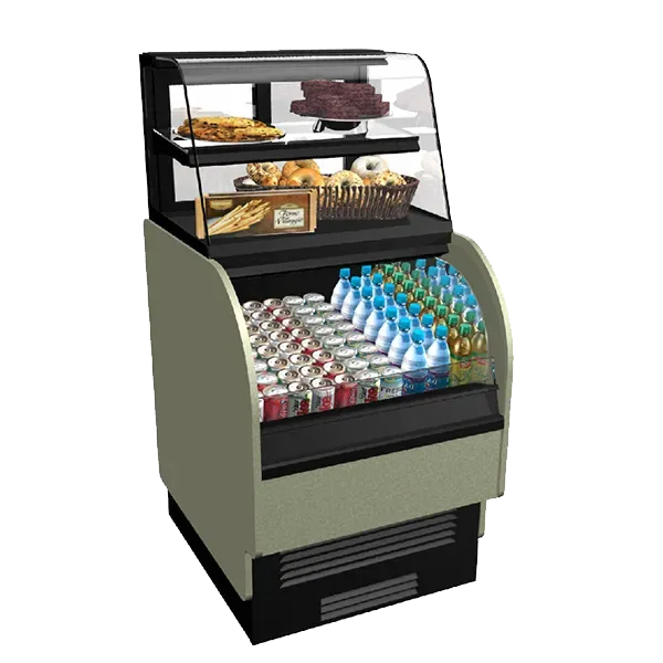 Upgrade equipment with the Structural Concepts COU2757R Display Case. This versatile merchandiser is perfect for commercial restaurant use, offering both service and self-service options. The upper section features a fixed front glass with a lighted glass shelf, allowing for attractive display of non-refrigerated items. The clear glass sliding rear doors provide easy access and visibility. In the lower section, the open front design allows for self-service of refrigerated items. The Breeze with EnergyWise self-contained refrigeration system ensures optimal temperature control and efficiency. The angled deck and black interior create an appealing presentation, while the laminate exterior and full end panels with mirrors add a touch of elegance. With casters for easy mobility, this display case is cETLus and ETL-Sanitation certified. Upgrade your restaurant equipment with the Structural Concepts COU2757R and enhance your food display and service capabilities.