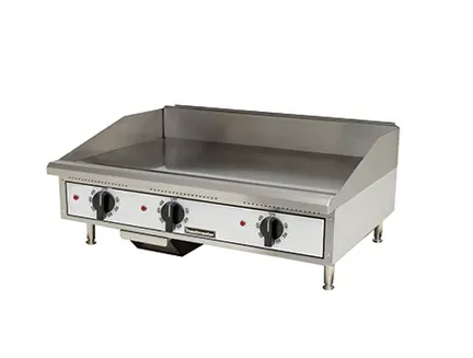 Streamline workflow with the Toastmaster TMGE36 Electric Countertop Griddle. Designed for commercial restaurant use, this griddle offers a spacious 36" W x 21" D cooking surface, allowing you to cook multiple items simultaneously. The 3/4" thick polished steel plates ensure even heat distribution, while the three steel radiants provide consistent and efficient cooking performance. With thermostatic controls, you can easily adjust the temperature to suit different recipes and cooking preferences. The removable drip tray and 3-1/4" front grease trough and chute make cleaning a breeze, saving you valuable time and effort. This griddle also features side and rear splash guards to prevent any mess or splatter. Made in the USA and UL EPH Classified, the Toastmaster TMGE36 Electric Countertop Griddle combines durability, functionality, and safety, making it an essential addition to any commercial kitchen.