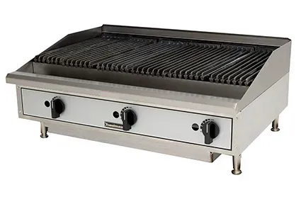 Enhance versatility with the Toastmaster TMRC36 Gas Countertop Charbroiler. Designed for commercial restaurant use, this 36" wide charbroiler offers exceptional performance and durability. The heavy stainless steel radiants and cast iron broiling grates ensure even heat distribution and excellent searing capabilities. With adjustable manual controls every 12", you have precise control over the 30,000 BTU burners, allowing you to achieve the perfect char on your meats and vegetables. The stainless steel water pan, splash guard, and grease trough make cleaning a breeze, while the aluminized steel sides and welded steel frame with a stainless steel top and front provide long-lasting durability. With a powerful 90,000 BTU output, this charbroiler is cULus and UL EPH Classified, guaranteeing its safety and reliability. Upgrade your restaurant's grilling capabilities with the Toastmaster TMRC36 Gas Countertop Charbroiler.