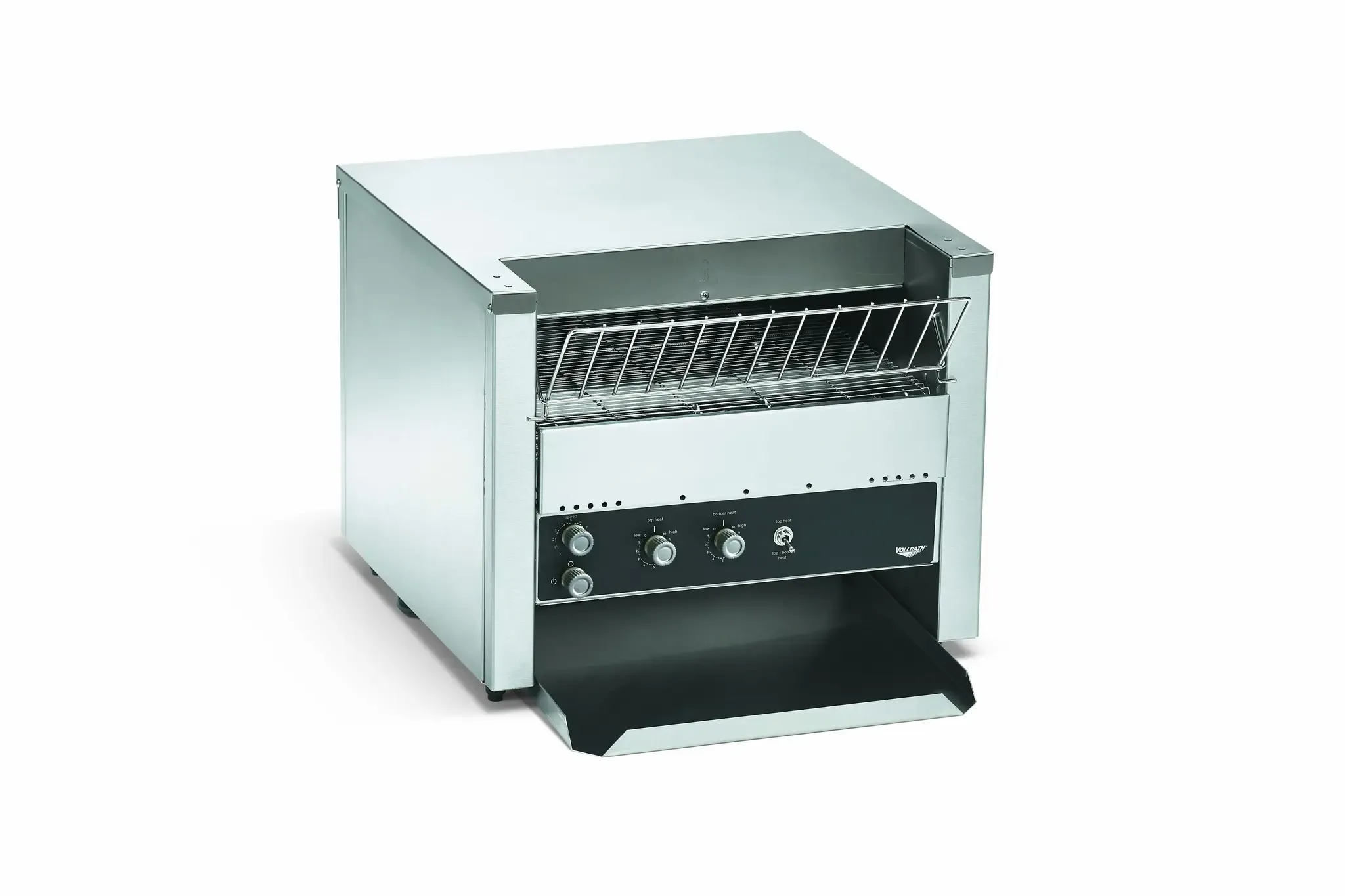 This JT3BH bun or bagel conveyor toaster by Vollrath is consistent, reliable and energy-efficient. Powerful quartz heating elements respond quickly, while forced convection ensures consistent toasting. The variable-speed control and variable top and bottom heat controls help you achieve desired results. Standby mode reduces energy use up to 75 percent during slow periods and quickly returns the unit to full power when needed. The adjustable 1 ½- to 3-inch product opening fits a variety of items, making this toaster ideal for bread, buns, bagels and more. The 14 ½-inch-wide conveyor can fit up to 1400 bun halves or 950 bread slices per hour. The durable stainless and aluminized steel exterior is built to last, and heavy-duty legs allow leveling adjustments to provide maximum stability on any countertop.