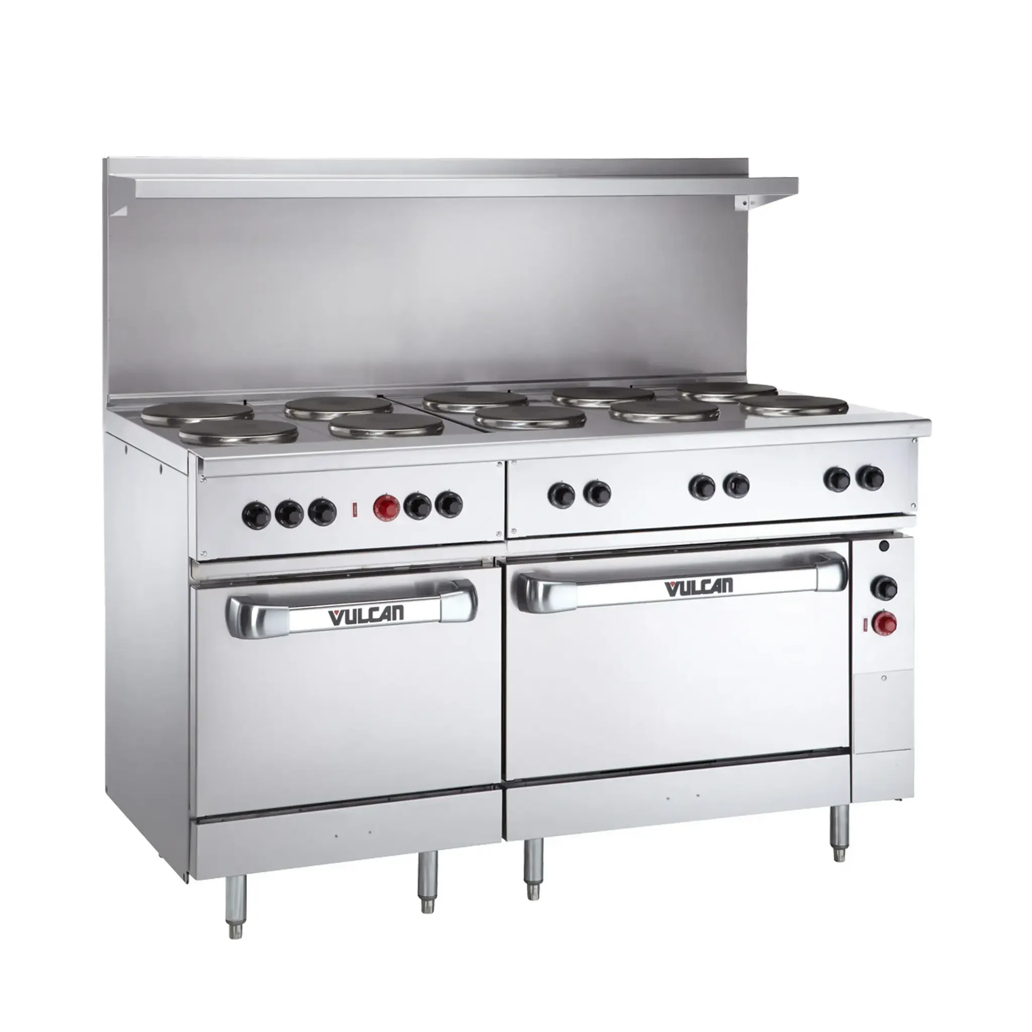Achieve culinary excellence with the Vulcan EV60SS-10FP208 Range, a top-of-the-line electric restaurant range designed to elevate your cooking experience. This 60" range features (10) 2.0 kW French hotplates, each equipped with a 9-1/2" solid cast iron plate and infinite controls, allowing for precise temperature adjustments. The range also includes (1) standard and (1) oversized oven, both with a rack, providing ample space for baking and roasting. With a stainless steel front, sides, single-deck high shelf, and 6" legs, this range is not only durable but also easy to clean, making it perfect for the demanding environment of a commercial restaurant. Powered by 208v, this range ensures efficient and consistent cooking performance. Whether you're running a bustling kitchen or a fine dining establishment, the Vulcan EV60SS-10FP208 Range is the ideal choice for achieving culinary excellence.