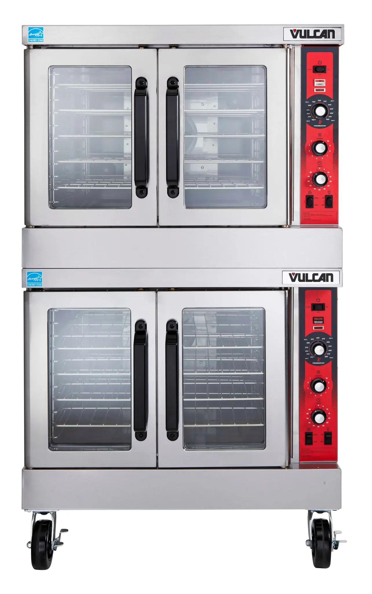 Fuel your restaurant's success with the Vulcan SG44 Convection Oven. This gas-powered, double-deck oven is designed to meet the demands of a busy commercial kitchen. With solid state controls and electronic spark ignition, you can easily adjust the temperature from 150 to 500F to achieve perfect results every time. The gentle bake mode selector switch ensures even and consistent cooking, while the 60-minute timer with an audible alarm keeps you on track. The stacking kit allows you to maximize your kitchen space, and with five oven racks per section, you can cook large quantities of food at once. The independently operated doors with windows allow you to monitor your dishes without opening the oven, saving energy and maintaining temperature. The porcelain enamel interior is easy to clean, and the stainless steel doors, front, sides, and top provide durability and a sleek appearance. With two 1/2 HP motors and 60,000 BTUs, this oven is both powerful and efficient. CSA, NSF, and ENERGY STAR certified, the Vulcan SG44 Convection Oven is a reliable and energy-efficient choice for any commercial restaurant.