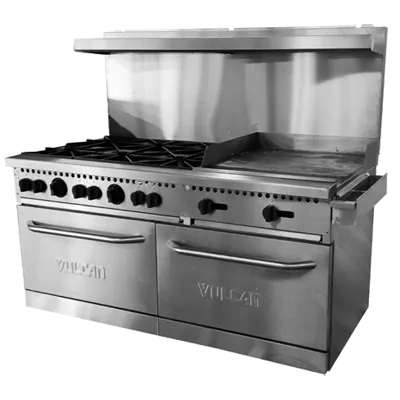 Unleash gastronomic brilliance with the Vulcan SX60F-6B24GN Range, a must-have for any commercial restaurant. This 60" restaurant range is designed to elevate your culinary creations to new heights. With six 28,000 BTU burners featuring lift-off burner heads, you'll have precise control over your cooking process. The 24" griddle provides a versatile cooking surface for pancakes, burgers, and more. Two standard ovens offer ample space for baking and roasting, ensuring efficiency during peak hours. The stainless steel construction of the front, sides, backriser, and high shelf not only adds durability but also enhances the professional appearance of your kitchen. The fully MIG welded frame guarantees stability and longevity. With 6" adjustable legs, you can easily customize the height to fit your needs. With a powerful 258,000 BTU output, this range is ETL-Sanitation certified, ensuring safety and compliance. Elevate your restaurant's cooking capabilities with the Vulcan SX60F-6B24GN Range.