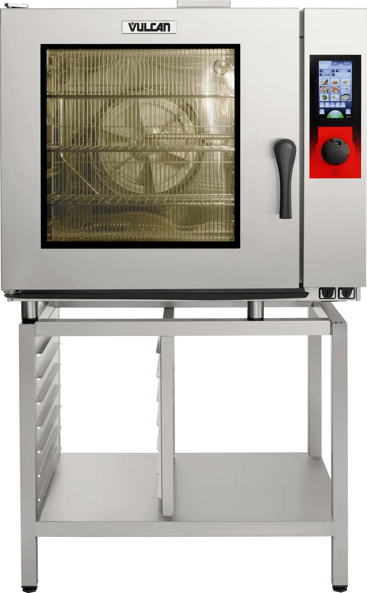 Elevate your cuisine with the Vulcan TCM-61E-208/240 Combi Oven. This electric oven is a game-changer for commercial restaurants, offering a range of features that will enhance your cooking experience. With a capacity of six 18"x13"x1" half sheet pans or six 12"x20"x2.5" steam pans, you can easily prepare large quantities of food. The twin control LCD touchscreen and knob allow for precise temperature and cooking time adjustments, while the multi-function modes with exclusive ABC control provide versatility in cooking techniques. The automatic cleaning feature with water recirculation ensures easy maintenance, and the cool touch door guarantees safety in a busy kitchen. Additionally, the LED light strip and USB port add convenience and functionality. With its adjustable feet and NSF and cULus certifications, the Vulcan TCM-61E-208/240 Combi Oven is a reliable and efficient choice for any commercial restaurant.
