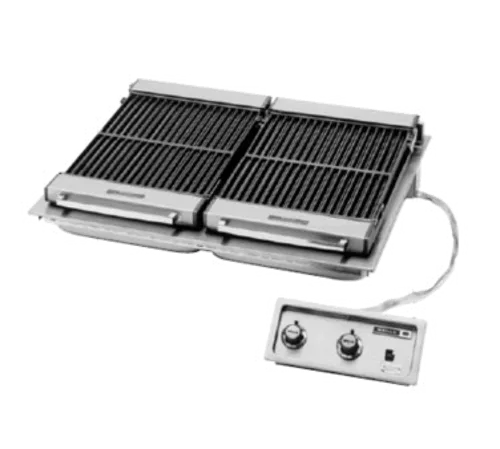 Wells B-506 Built-In 36" Wide Charbroiler has a stainless-steel top and sides that make this broiler one of the most durable in the industry. Self-cleaning elements are positioned between the broiler grate ribs to protect against direct food contact and spatula abrasion and are protected by the heavy-duty cast-iron grates and provide two heat zones for flexibility in broiling. Temperature is regulated by two individual infinite controls that are recessed in a one-piece, drawn, stainless steel panel. Wellslock allows for quick and easy installation and a lift-out, drawn drip pan with handles, and a grate scraper/brush are provided.