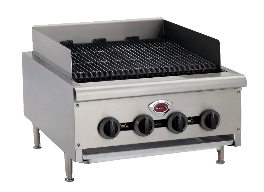 Wells HDCB-3630G Gas Countertop Charbroiler features extra heavy-duty cast iron burners, cast-iron radiants, and reversible cast-iron grates for higher heat, consistent temperatures, and quicker recovery. Each burner features operator adjustable infinite heat adjustment and On/Off control and adjustable air shutter to control air and optimize combustion. Stainless-steel side panels and splash guard, removable drip pan for ease of clean-up and adjustable 4" heavy-duty steel legs. Ships in natural gas and are field convertible to LP Gas. 36"W x 30"D cooking surface, 120K BTU, and 6 burners.