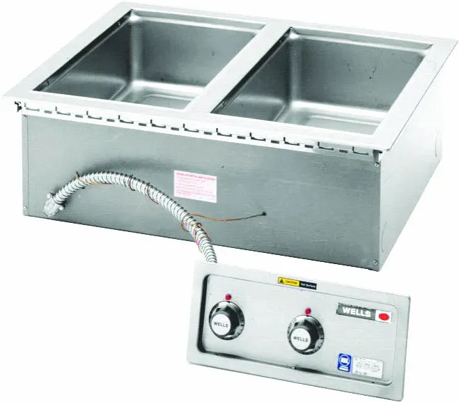 Wells MOD-200DM heavy-duty, top-mount, drop-in, Modular food warmer is designed to hold heated foods at safe and fresh serving temperatures. Unit Accommodates 12" x 20" standard food pans or equivalent fractional inset pans and are designed for wet or dry operation. One-piece stainless steel top flange and heavy-gauge, deep-drawn stainless steel warming pans are standard features on all models. WellsLoks are standard for quick and easy installation. Sides, front, back, and bottom are fully insulated, Individual controls for each well, High-limits prevent overheating, and powerful tubular heating elements are located under the warming pans for quick, efficient, and even heating. Two pans, infinite control, Drain with Manifold, 208/240V