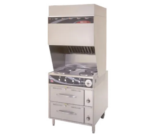 Wells WV-4HFRW Universal hood VCS 2000 Ventless Cooking System is Certified Type-1 compliant, UL710B approved recirculation hood system and feature completely self-contained 4-stage air filtration and fire-suppression systems integrated with hood and cooking equipment in one, ready to use package. It does not require venting outside making it possible to cook in nontraditional locations or when traditional Type-1 hoods and ductwork are impractical, restricted, or too expensive. Completely self-contained ANSUL® R-102 system, quiet 68 dBA average, illuminated early-warning system to monitor filter replacement, stainless-steel construction, and Fits through 36" wide door opening are just a few features. drawer warmer base, top - (4) French hot plates, 1-phase, 208/240V