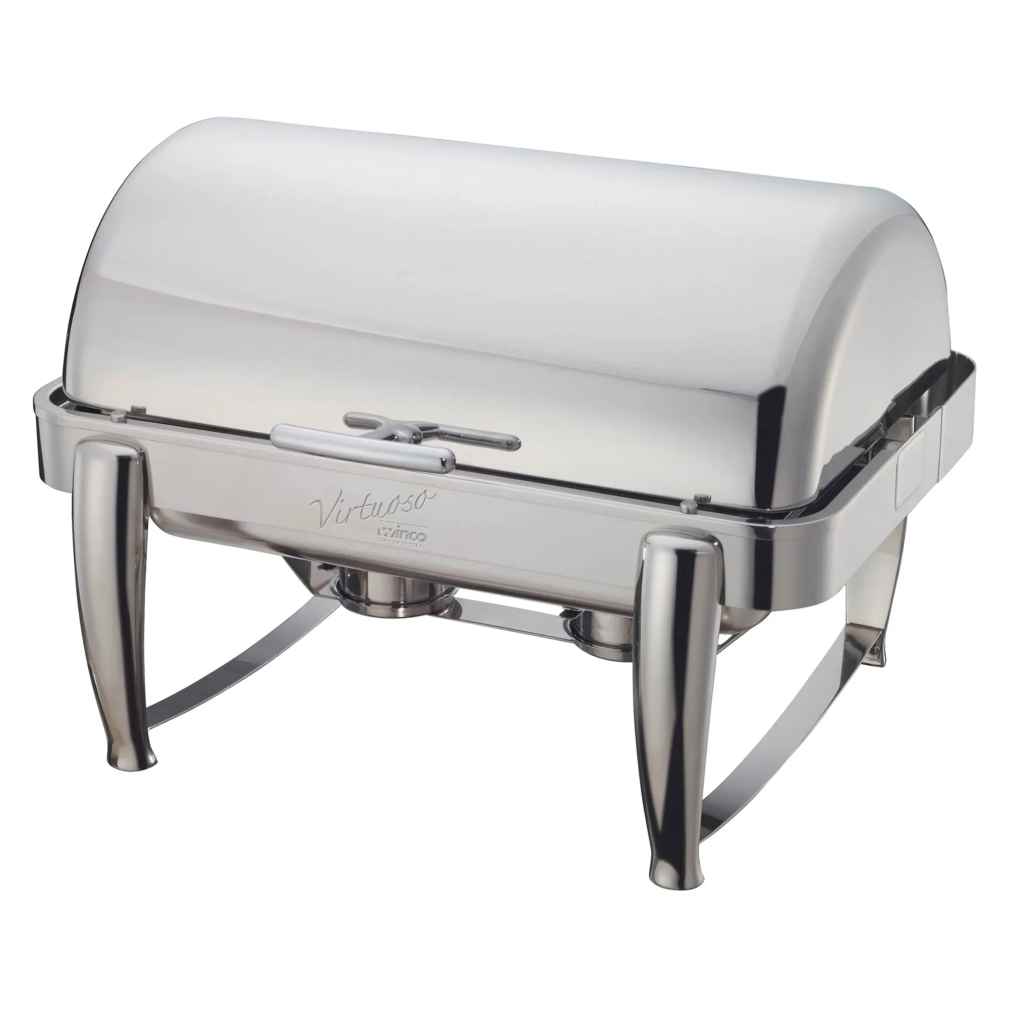Ideal for professional settings, the Virtuoso Chafer by Winco is an exceptional addition to any restaurant's buffet or catering service. This 8 qt. full-size rectangular roll-top chafer, model 101B, is designed to meet the highest standards of quality and functionality. Crafted from 188 stainless steel with a mirror finish, the Virtuoso Chafer not only exudes elegance but also ensures durability and longevity. Its extra heavyweight construction provides stability and reliability, making it a dependable choice for busy restaurant environments. The roll-top design offers convenience and ease of use, allowing guests to serve themselves effortlessly while keeping the food warm and protected. The Virtuoso Chafer includes a food pan, water pan, and two fuel holders, ensuring that your dishes remain at the perfect serving temperature throughout the event. The stackable feature of this chafer makes storage and transportation a breeze, saving valuable space in your kitchen or storage area. Whether you're hosting a large banquet or a small gathering, the Virtuoso Chafer by Winco is designed to enhance the dining experience with its superior functionality and sophisticated appearance. Its mirror finish adds a touch of class to any setting, making it a versatile and practical choice for professional caterers and restaurateurs alike. In summary, the Virtuoso Chafer, model 101B, is a top-tier product that combines style, durability, and practicality, making it an indispensable tool for any restaurant looking to elevate its service and presentation.