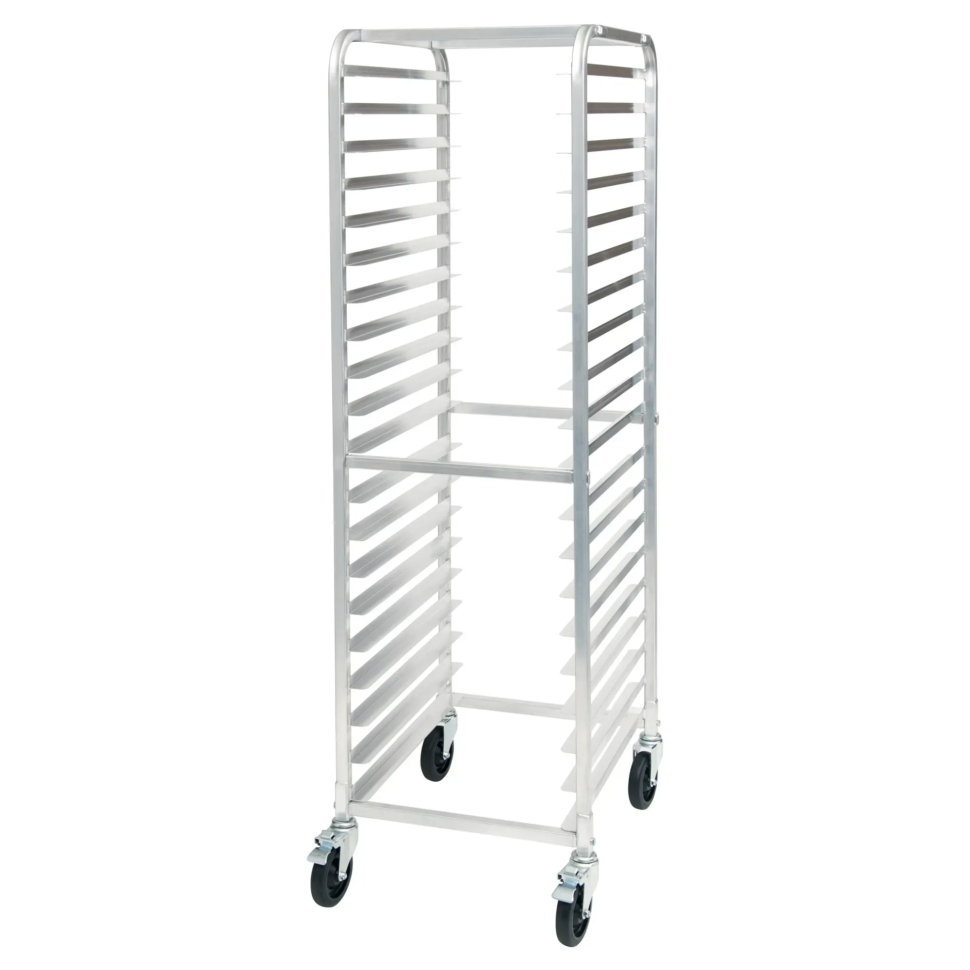 Make a statement in the kitchen with the Winco Sheet Pan Rack. Designed for efficiency and durability, this mobile full-height rack is a must-have for any bustling restaurant. With the capacity to hold up to 20 full-size (18 x 26) or 40 half-size (18 x 13) sheet pans, it offers ample space for all your baking and storage needs. The robust construction supports an impressive 800 lb. capacity, ensuring it can handle even the heaviest loads with ease. The Winco Sheet Pan Rack features 4-inch swivel rubber casters, two of which come with brakes, providing both mobility and stability. This makes it easy to maneuver around the kitchen and secure it in place when needed. The 3-inch runner spacing is ideal for accommodating various pan sizes, making it versatile for different culinary tasks. Crafted from welded aluminum, this rack is not only lightweight but also incredibly sturdy, promising long-lasting performance. Its NSF certification guarantees that it meets the highest standards for public health protection, making it a reliable choice for any professional kitchen. Whether you're organizing baked goods, prepping for a large event, or simply need extra storage, the Winco Sheet Pan Rack is designed to streamline your kitchen operations. Elevate your kitchen's efficiency and keep everything within reach with this essential piece of equipment.