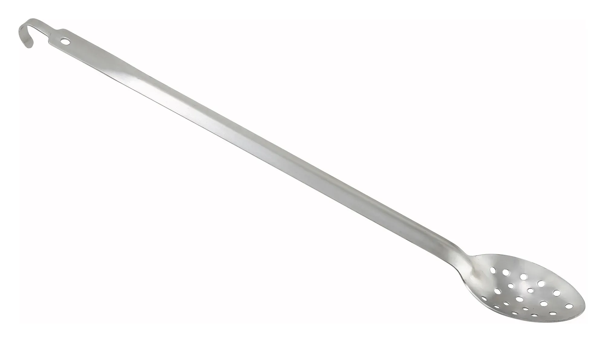 Elevate kitchen performance with the Winco Basting Spoon. Crafted with precision and durability in mind, this perforated heavy-duty basting spoon is an essential tool for any professional kitchen. Made from 2.0mm thick stainless steel, it promises longevity and resilience, even in the most demanding restaurant environments. The perforated design of the Winco Basting Spoon allows for efficient draining of excess liquids, making it perfect for basting meats, serving vegetables, or skimming broths. Its robust construction ensures it can handle the rigors of daily use without bending or breaking, providing consistent performance you can rely on. One of the standout features of this basting spoon is its convenient hang hook. This practical addition allows for easy storage, keeping your kitchen organized and your tools within reach. The heavy-duty nature of the spoon, combined with the hang hook, ensures that it remains a staple in your kitchen for years to come. While the model number BHKP-21 may not be the first thing you consider, it signifies the quality and reliability that Winco is known for. This basting spoon is not just a tool; it's an investment in your kitchen's efficiency and your culinary creations' quality. In summary, the Winco Basting Spoon is a must-have for any restaurant looking to enhance its kitchen operations. Its durable stainless steel construction, perforated design, and practical hang hook make it an indispensable tool for chefs and kitchen staff alike.