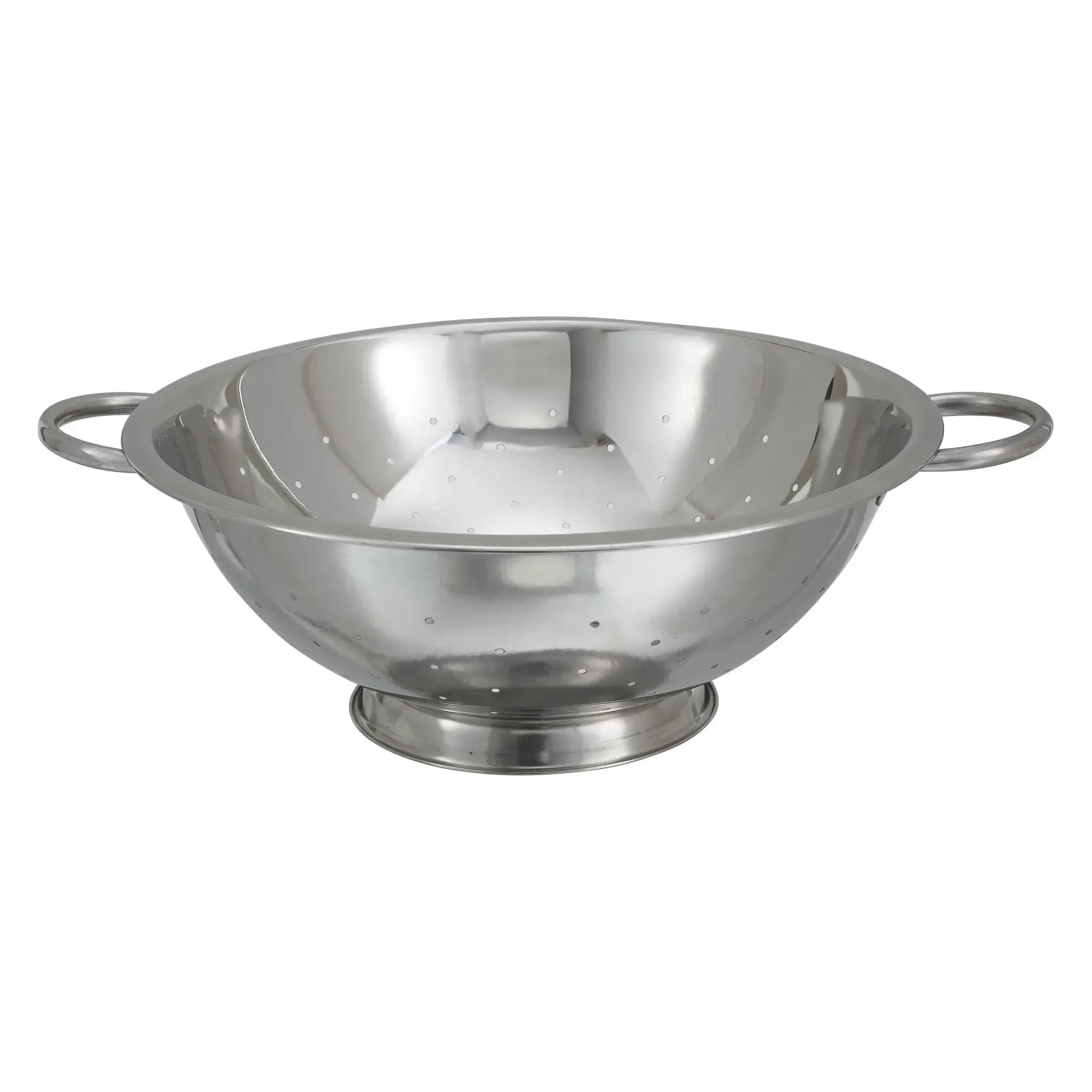 Optimize kitchen workflow with the Winco Stainless Steel Colander. Designed to meet the rigorous demands of a bustling restaurant kitchen, this 8-quart colander is an essential tool for any culinary professional. With a generous 14-inch diameter, it provides ample space for draining large quantities of pasta, rinsing vegetables, or straining stocks and broths. Crafted from high-quality stainless steel, the Winco Stainless Steel Colander ensures durability and longevity, standing up to the daily wear and tear of a busy kitchen. Its robust construction not only resists rust and corrosion but also maintains its sleek appearance over time, making it a reliable and attractive addition to your kitchen arsenal. The round design of the colander allows for even and efficient draining, while the strategically placed perforations ensure quick and thorough water removal. This feature is particularly beneficial in a fast-paced restaurant environment where time and efficiency are paramount. While the model number COD-8 may be useful for inventory and ordering purposes, the true value of this colander lies in its practical design and sturdy build. Its versatility and ease of use make it a must-have for any professional kitchen, enhancing both the speed and quality of food preparation. Incorporate the Winco Stainless Steel Colander into your kitchen setup and experience the difference it makes in your daily operations. Its combination of size, durability, and efficiency will help streamline your workflow, allowing you to focus on creating exceptional dishes for your customers.