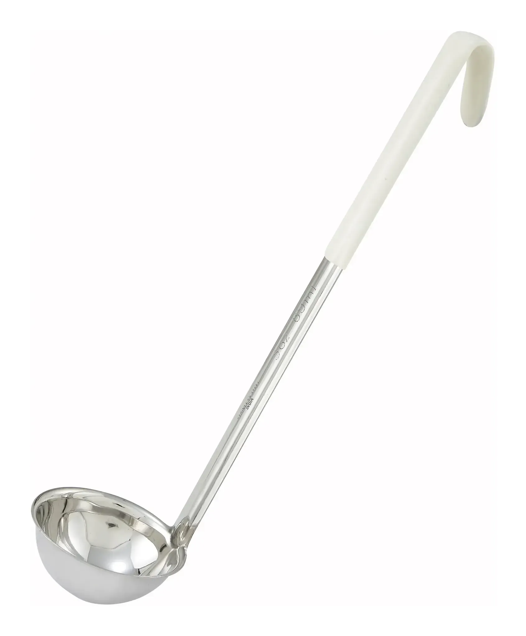 Achieve professional-level results with the Winco Color-Coded Ladle. Designed specifically for the demanding environment of a restaurant kitchen, this 3 oz. ladle is an essential tool for precise portion control and efficient service. The 13-inch handle provides ample reach, ensuring you can easily serve soups, sauces, and dressings from deep pots and containers without compromising on comfort or control. Crafted from one-piece stainless steel, the Winco Color-Coded Ladle is built to withstand the rigors of daily use while maintaining its sleek appearance. The durable construction ensures that it won't bend or break, even under heavy use, making it a reliable addition to your kitchen arsenal. The ivory color-coding on the handle is not just for aesthetics; it plays a crucial role in maintaining food safety and preventing cross-contamination. By designating specific ladles for different types of food, you can ensure that your kitchen adheres to the highest standards of hygiene and efficiency. While the model number LDC-3 may not be the first thing you consider, it signifies Winco's commitment to quality and consistency. This ladle is a testament to their expertise in creating kitchen tools that meet the unique needs of professional chefs and restaurant staff. Incorporate the Winco Color-Coded Ladle into your kitchen today and experience the perfect blend of functionality, durability, and safety. Whether you're serving a delicate consommé or a hearty stew, this ladle will help you achieve impeccable results every time.