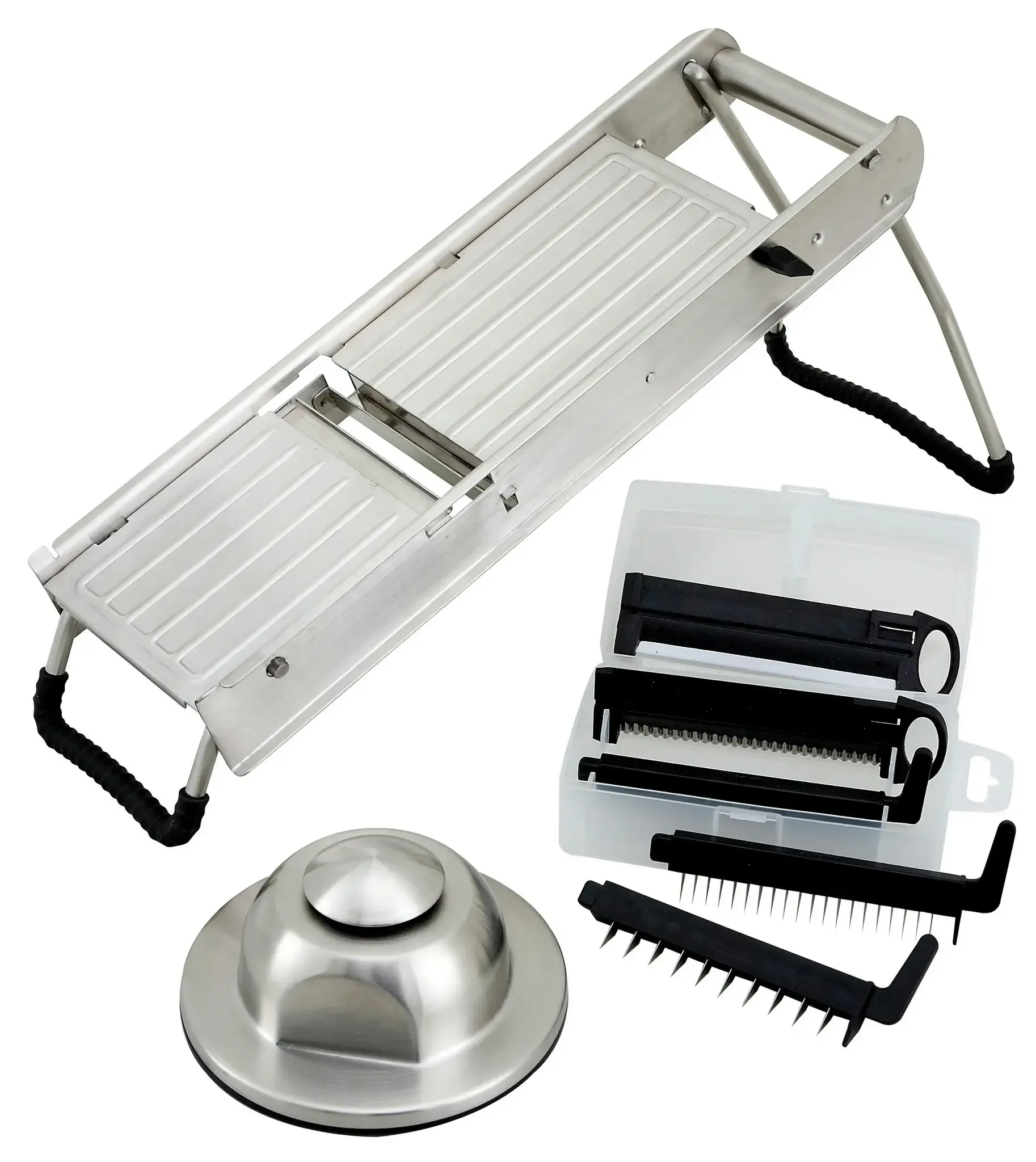 Crafted for professionals with precision and efficiency in mind, the Winco Mandoline Slicer Set is an indispensable tool for any restaurant kitchen. This high-quality slicer set, model MDL-15, features a robust stainless steel construction, ensuring durability and long-lasting performance even in the most demanding culinary environments. The Winco Mandoline Slicer Set measures 15-12 x 4-1516, making it compact yet versatile enough to handle a variety of slicing tasks. It comes equipped with five interchangeable blades, allowing chefs to effortlessly switch between different slicing styles and thicknesses. Whether you need to create perfectly uniform julienne cuts, thin slices for garnishes, or thicker slices for hearty dishes, this mandoline slicer set has you covered. Safety is paramount in a busy kitchen, and the Winco Mandoline Slicer Set includes a handguard to protect your fingers while slicing. This feature ensures that even during high-speed operations, chefs can work confidently and safely. The stainless steel construction not only provides a sleek and professional appearance but also makes the slicer set easy to clean and maintain. Its sturdy design ensures that it can withstand the rigors of daily use, making it a reliable addition to any restaurant's kitchen arsenal. In summary, the Winco Mandoline Slicer Set, model MDL-15, is a versatile, durable, and safe tool designed to meet the high standards of professional chefs. Enhance your kitchen's efficiency and precision with this essential slicer set, and experience the difference it can make in your culinary creations.