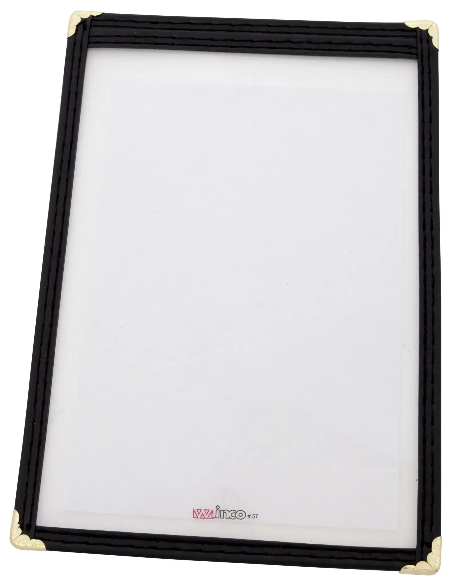 Simplify kitchen tasks with the Winco Menu Cover. Designed to enhance the dining experience, this sleek and durable menu cover is perfect for any restaurant setting. Measuring 6-3/8 x 9-3/8 inches, it is tailored to hold 5-5/8 x 8-1/8 inch paper, making it an ideal fit for your menu inserts. Crafted with double-stitched edging, the Winco Menu Cover ensures long-lasting durability, even in the busiest of dining environments. The black plastic material not only provides a professional and elegant appearance but also offers easy maintenance and cleaning, ensuring your menus always look pristine. The Winco Menu Cover, model PMC-5K, is designed with both functionality and style in mind. Its sturdy construction and refined look make it a valuable addition to any restaurant, enhancing the overall dining experience for your guests. The double-stitched edging adds an extra layer of durability, ensuring that the menu cover withstands the rigors of daily use. Incorporating the Winco Menu Cover into your restaurant's presentation will not only protect your menus but also elevate the aesthetic appeal of your dining area. Its practical design and robust build make it a must-have for any establishment looking to combine elegance with functionality. Choose the Winco Menu Cover for a reliable and stylish solution to your menu presentation needs.
