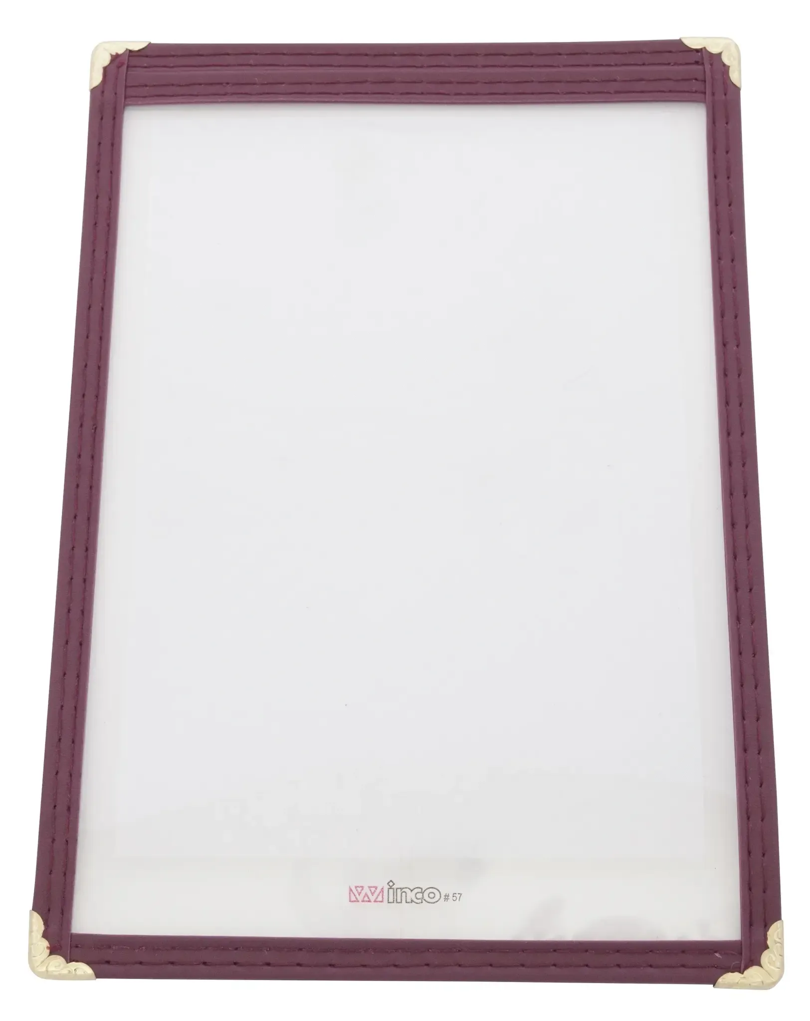 Elevate service with the Winco Menu Cover, a sophisticated and durable solution designed to enhance your restaurant's presentation. This elegant menu cover, model PMC-5U, is crafted to hold 5-5/8 x 8-1/8 inch paper, making it perfect for showcasing your menu items in a refined manner. The Winco Menu Cover features a single overall size of 6-3/8 x 9-3/8 inches, providing ample space for your menu inserts while maintaining a sleek and professional appearance. The double-stitched edging ensures durability and longevity, even in high-traffic restaurant environments. This meticulous stitching not only adds to the cover's durability but also gives it a polished and upscale look that will impress your guests. Constructed from high-quality plastic, the Winco Menu Cover is easy to clean and maintain, ensuring that your menus always look fresh and inviting. The rich burgundy color adds a touch of elegance and sophistication, complementing a wide range of restaurant decors. Whether you run a fine dining establishment, a casual eatery, or a bustling café, the Winco Menu Cover is an essential accessory that combines functionality with style. Its robust construction and refined design make it a valuable addition to any restaurant setting, helping you present your menu in the best possible light. Choose the Winco Menu Cover to elevate your service and leave a lasting impression on your guests.