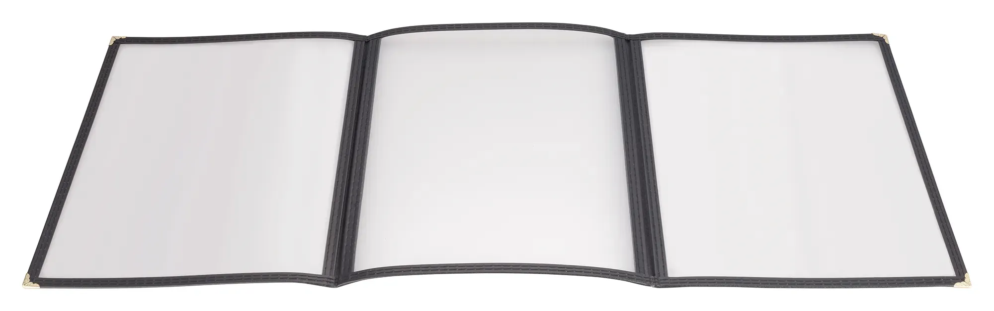 Perfect for everyday use in a bustling restaurant environment, the Winco Triple Fold Menu Cover is an essential addition to your dining establishment. Designed with practicality and durability in mind, this menu cover boasts an overall size of 9-12 x 12-18 inches, perfectly accommodating 8-12 x 11-inch paper inserts. This ensures your menus are presented in a professional and organized manner, enhancing the dining experience for your guests. The Winco Triple Fold Menu Cover features double-stitched edging, providing extra strength and longevity, making it ideal for high-traffic restaurants where menus are frequently handled. The black plastic material not only offers a sleek and modern look but also ensures easy cleaning and maintenance, keeping your menus looking pristine at all times. The triple fold design of this menu cover allows for ample space to display a variety of menu items, specials, and promotions, making it easier for your customers to navigate through your offerings. The clear plastic windows protect your menu inserts from spills and stains, ensuring they remain in excellent condition. While the model number PMCT-9K may not be immediately necessary for everyday use, it signifies the quality and reliability associated with Winco products. This menu cover is a practical and stylish solution for any restaurant looking to present their menus in the best possible light. Incorporate the Winco Triple Fold Menu Cover into your restaurant today and experience the perfect blend of functionality and elegance.