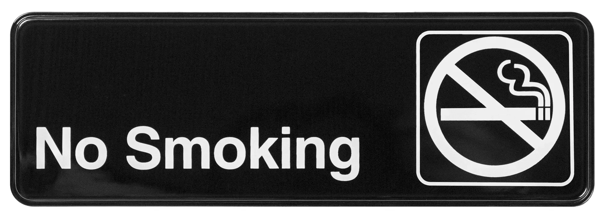 Essential for every chef with this Information Sign, the Winco SGN-310 is a must-have for maintaining a professional and compliant restaurant environment. This No Smoking sign, featuring a clear white imprint on a sleek black background, measures 9 x 3 inches, making it highly visible without being obtrusive.