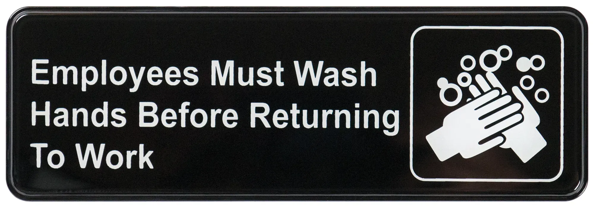 The white imprint on a black background provides high contrast, making the message "Employees Must Wash Hands Before Returning To Work" easily readable from a distance. This clarity is crucial in maintaining the highest standards of cleanliness and food safety, which are paramount in any dining establishment.