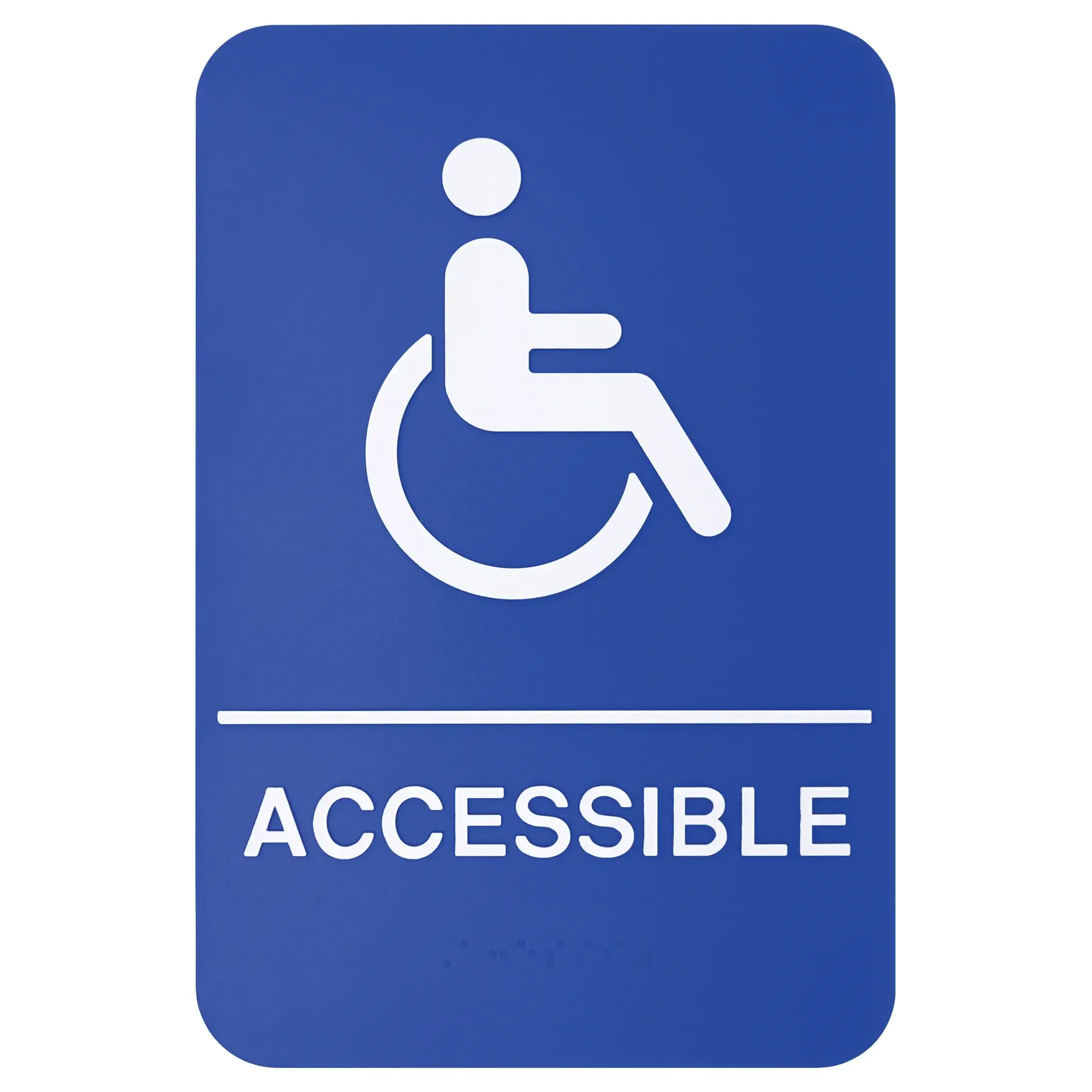 The ultimate tool for gourmet cooking is the Winco Accessible Sign. Designed specifically for restaurant settings, this sign ensures that your establishment is compliant with accessibility standards, providing a welcoming environment for all guests. The sign features a clear and easily recognizable symbol, measuring 6 x 9 inches, with braille to assist visually impaired individuals. The white imprint on a blue background ensures high visibility and readability, making it easy for all patrons to locate accessible areas within your restaurant.