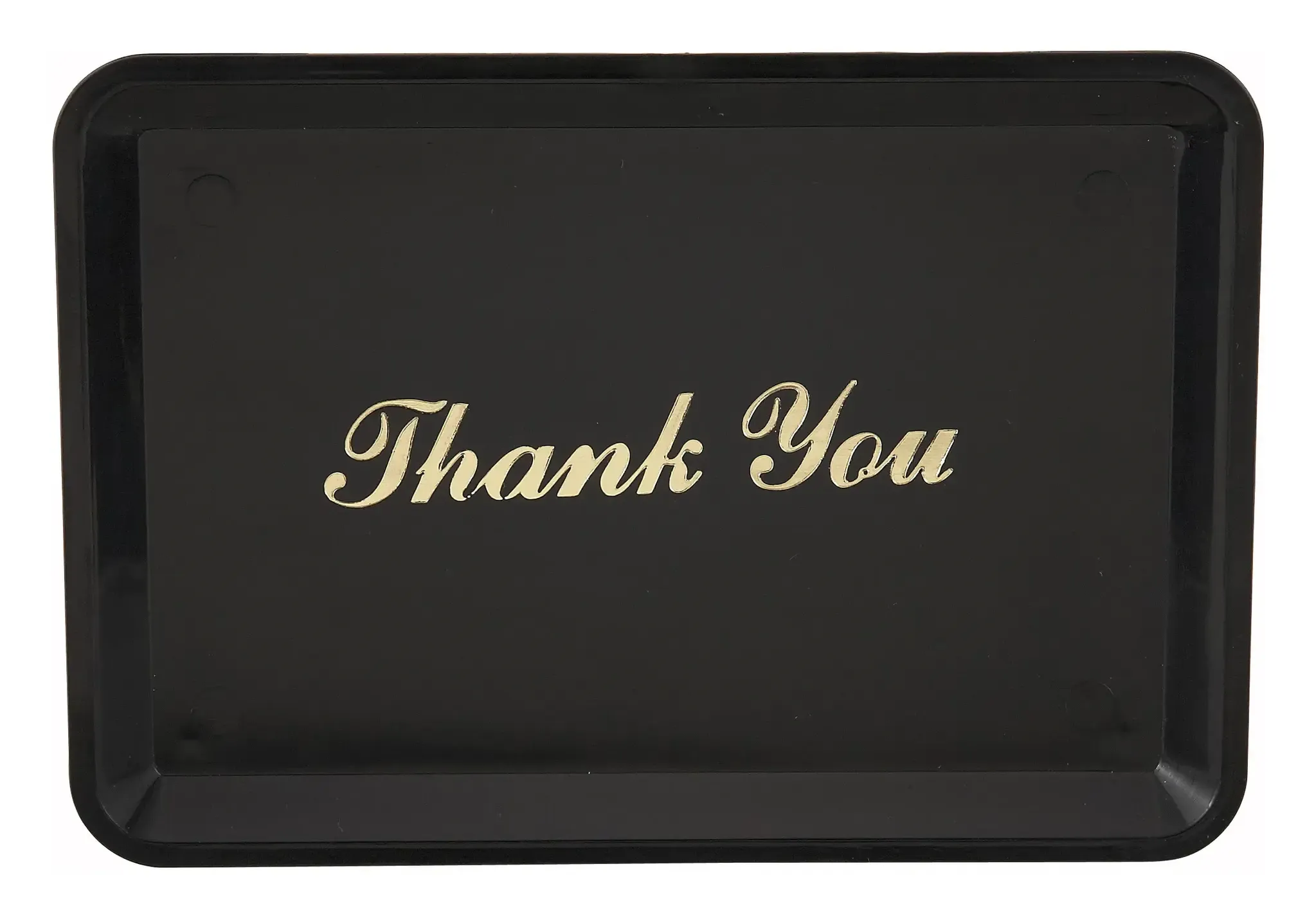 Crafted in a sleek black color, the Winco Tip Tray features a refined gold imprint that reads "Thank You," adding a touch of class and appreciation to every transaction. The durable plastic construction ensures longevity and ease of maintenance, making it a practical choice for high-traffic restaurant environments.