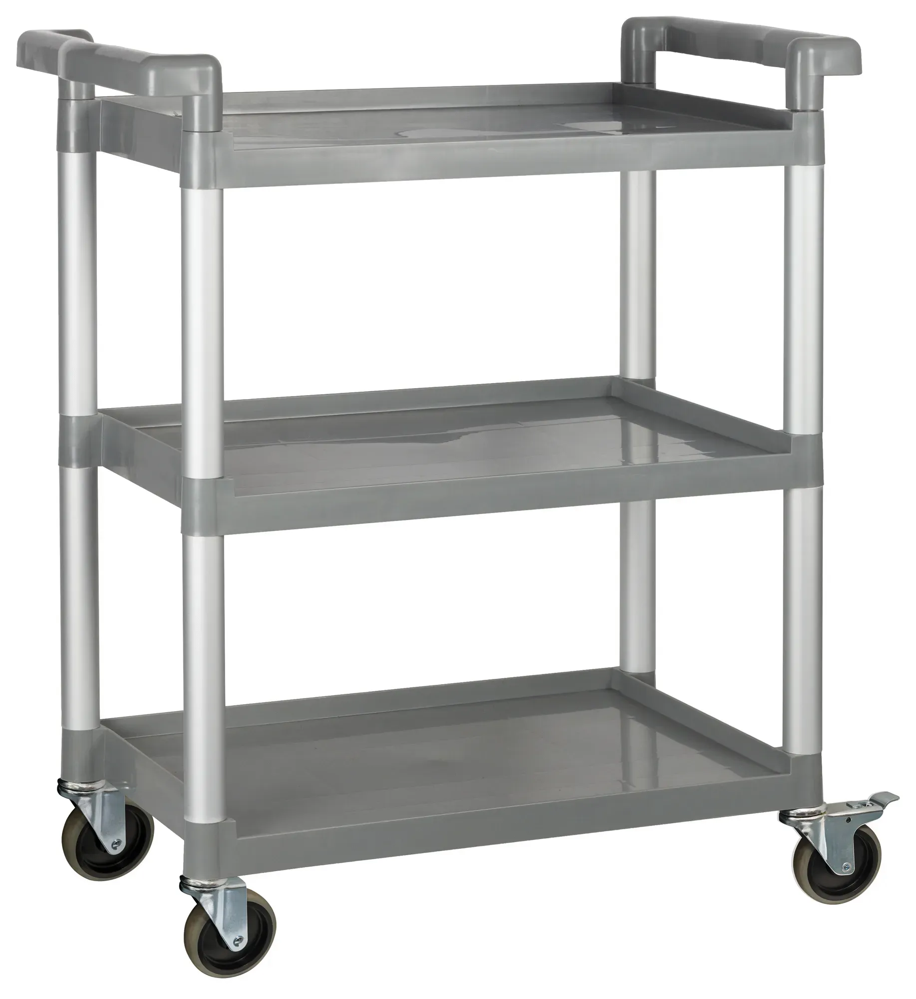 Enhance the cooking repertoire with the Winco Plastic Utility Cart. Designed to meet the rigorous demands of a bustling restaurant environment, this versatile cart is an essential addition to any kitchen or dining area. The Winco Plastic Utility Cart boasts a robust construction with dimensions of 32 inches in length, 16-18 inches in width, and 36-34 inches in height. Its three-tier design provides ample space for transporting a variety of items, from ingredients and utensils to prepared dishes and cleaning supplies. The gray color adds a sleek, professional touch that seamlessly blends with any restaurant decor. Crafted from durable plastic, this utility cart is both lightweight and sturdy, ensuring ease of maneuverability without compromising on strength. The three tiers offer organized storage, making it simple to keep essential items within reach and maintain an efficient workflow. Whether you're moving heavy pots and pans or delicate glassware, the Winco Plastic Utility Cart can handle it all with ease. While the model number UC-2415G may not be the first thing on your mind, it signifies the quality and reliability that Winco is known for. This cart is designed to withstand the daily wear and tear of a busy restaurant, providing long-lasting performance that you can count on. Incorporate the Winco Plastic Utility Cart into your restaurant's operations and experience the convenience and efficiency it brings. With its practical design and durable construction, this cart is a valuable asset for any food service establishment.