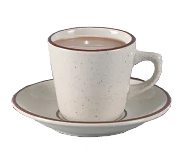 Maximize productivity using the Yanco Brown Speckled Saucer Royal. This elegant saucer, with a diameter of 5-1/2 inches, is designed to enhance the dining experience in any restaurant setting. Its round shape and classic brown speckled-American white finish, complemented by a subtle brown rim, make it a versatile addition to your tableware collection.